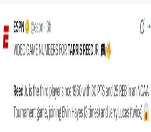 此役身高2.11米的小塔里斯-里德,34分钟,15中12,罚球9中7,拿到31分27篮板3助攻,命中率80%,这场比赛打出了NCAA生涯最高的一场比赛。