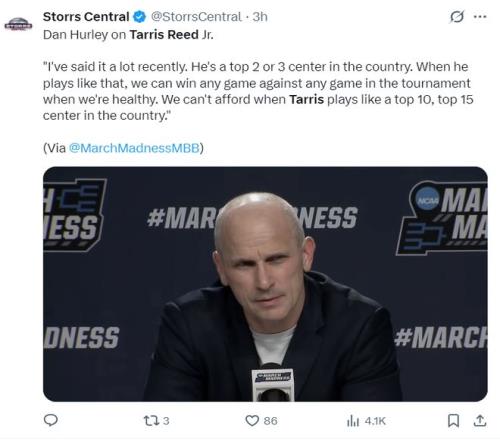 赛后康大主帅丹-赫利场边接受采访,他说道:这场比赛看起来里德真的像一头灰熊。