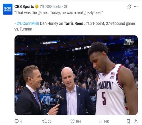 北京时间3月21日,NCAA疯狂三月首轮,康涅狄格大学82-72击败弗尔曼大学。这场比赛康涅狄格一直手握优势,上半场打完康大领先4分,下半场康大继续拉开差距。这场比赛康大三人上双+两人20+,弗尔曼大学也是三人上双+两人20+,不过康大有一个30+。