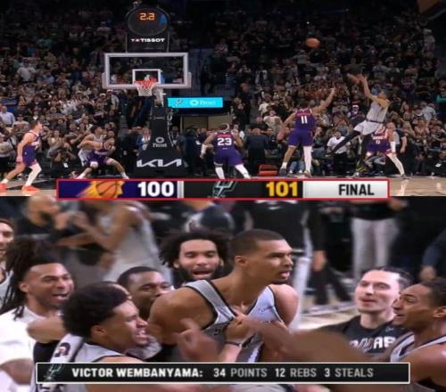 往前两场的话,文班亚马分别带队击败快船(伦纳德缺席)和国王(只打了22分钟),但他的数据多少有些比不上平时: